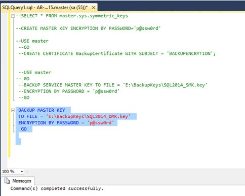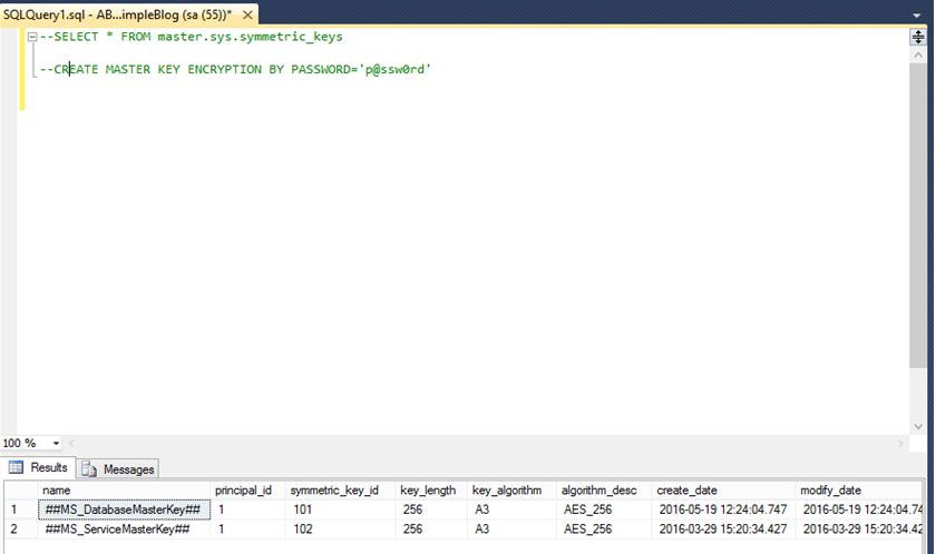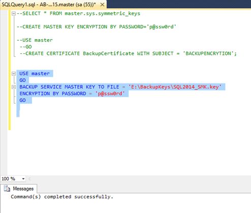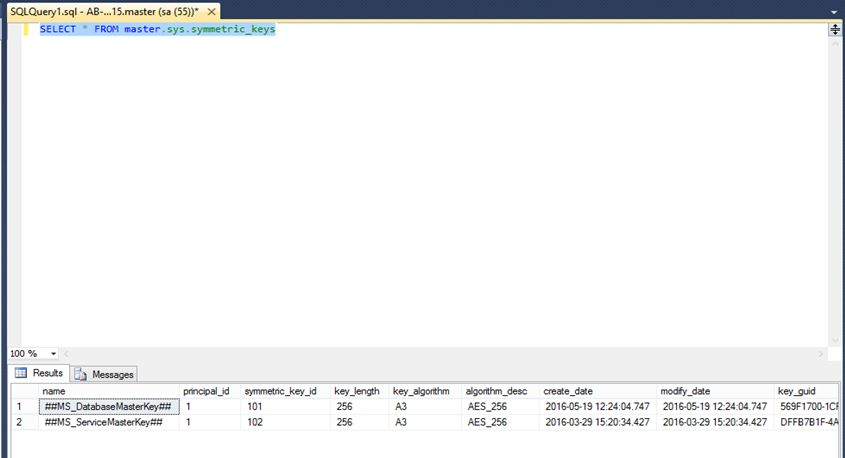 Let’s start SQL Server Backup Encryption in SQL Server 2014 while installing SQL Server 2014 Service Master Key (SMK) and Database Master Key (DMK) is generated automatically while installing SQL Server. Now you can check by performing a query sys.symmetric_keys.