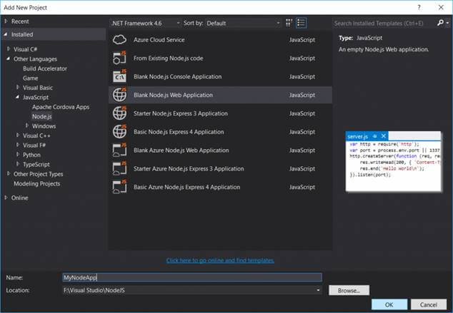 Thus, I hope you have installed the application. Now, you can create a Node JS Application in Visual Studio.