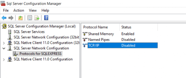Now, go to SQL Server Network Configuration and click Protocols for SQLEXPRESS (Your SQL Server) and enable TCP/IP.