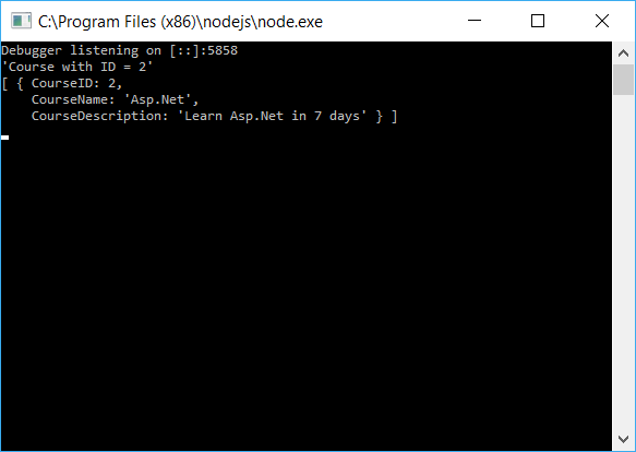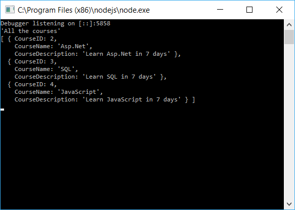 - .query("INSERT INTO [dbo].[Course] ([CourseName],[CourseDescription]) VALUES ('Node js', 'Learn Node JS in 7 days')",