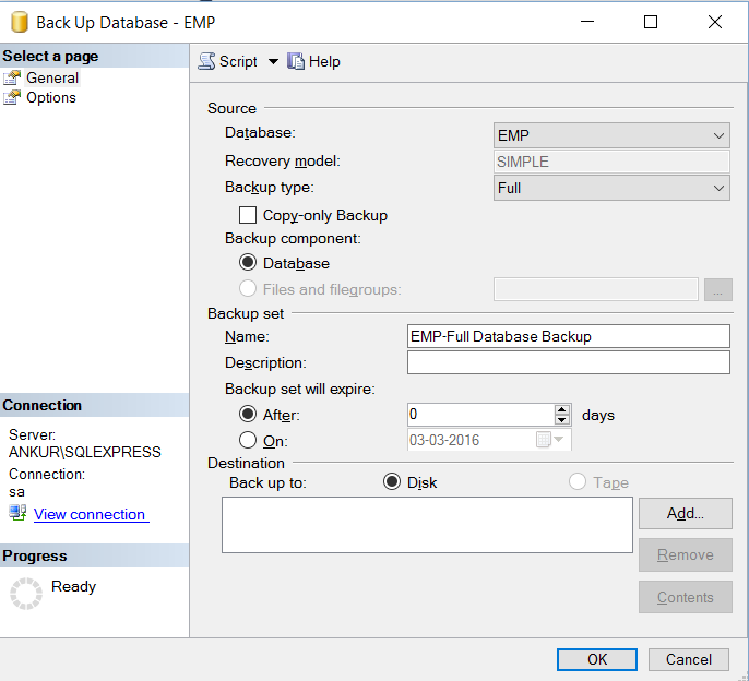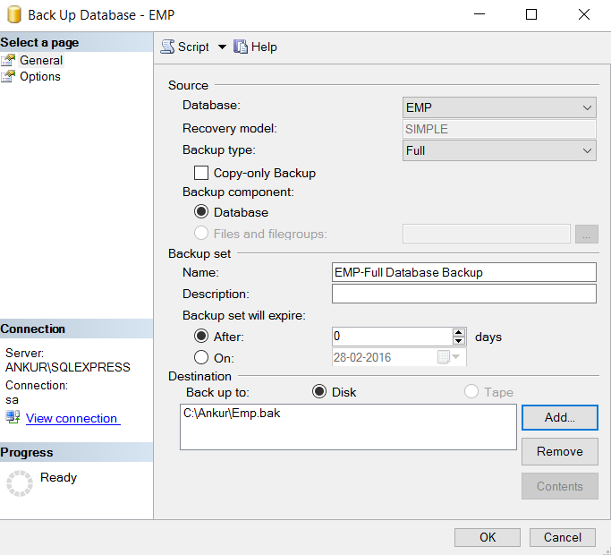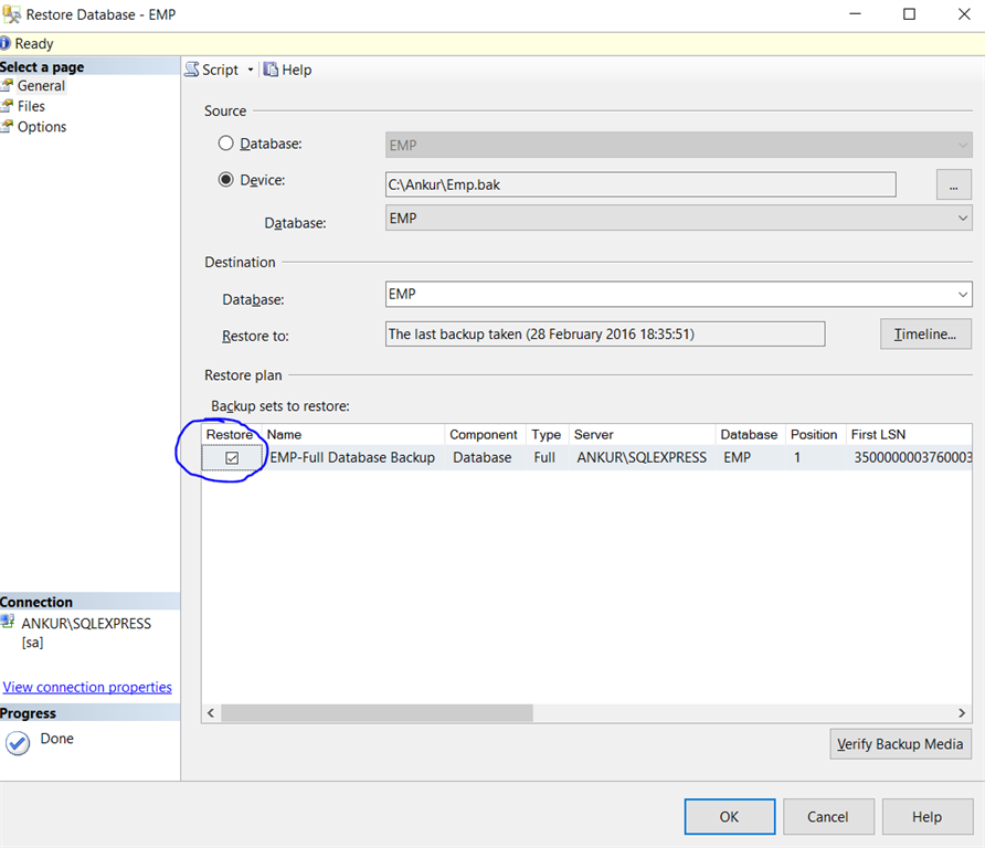 - BACKUP DATABASE [EMP] TO DISK = N'C:\Ankur\Emp.bak'