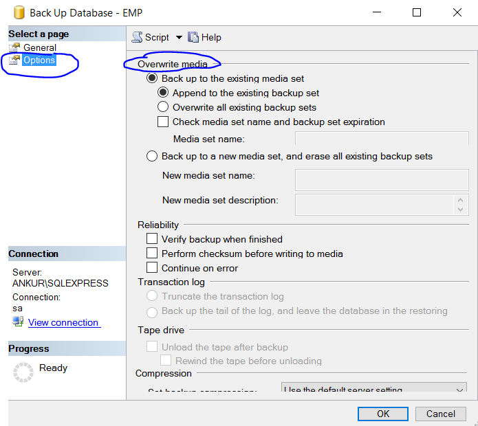 - WITH NOFORMAT, NOINIT, NAME = N'EMP-Full Database Backup', SKIP, NOREWIND, NOUNLOAD, STATS = 10