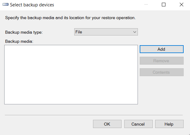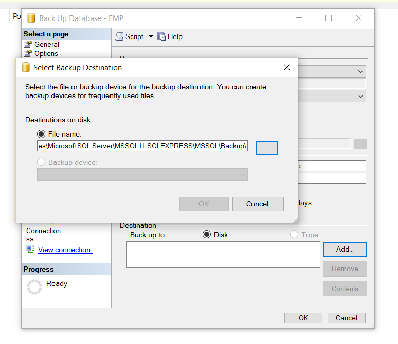 Now click on Add and select the file or backup device for the backup destination as shown in the below Screen and click OK.