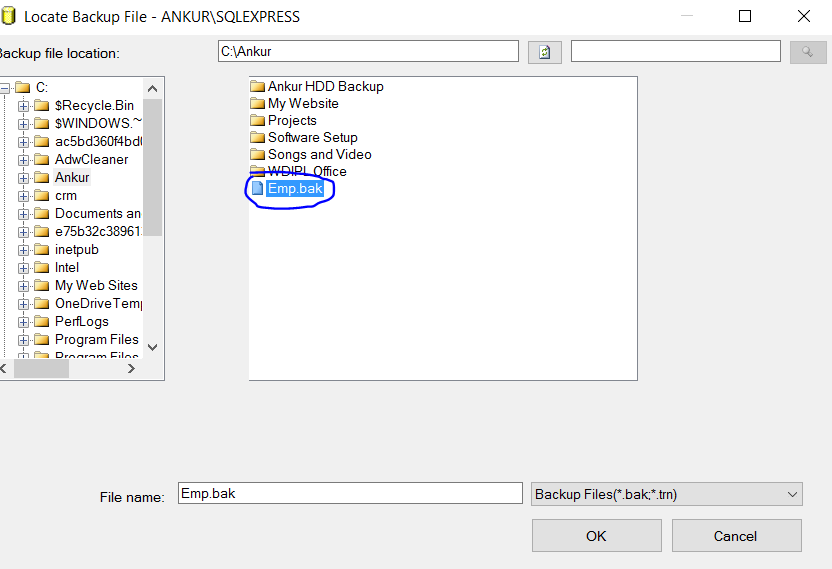 Step 4: Select the .bak file you want to Restore, here I am selecting Emp.bak file.