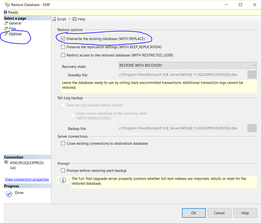 Step 6: Go to Option Tab and select Overwrite the existing database (WITH REPLACE) .