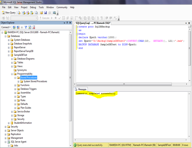 Let's create a stored procedure to take a back up on our local disk. To create a stored procedure, please refer to the image.