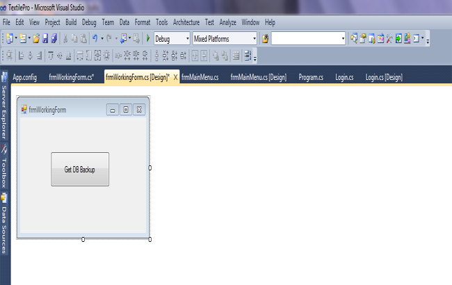Now, you can see an empty Form window. Let's drag one button from the toolbox and change the label text to "Get DB Backup".