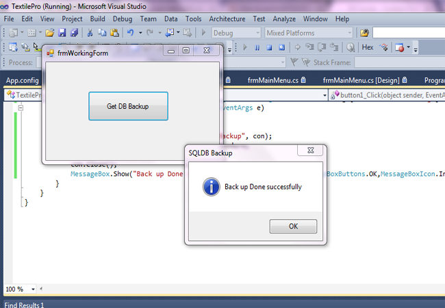 Step 8Let's run our project. To run it, press ctrl+F5. Click "Get DB Backup button" and you will receive a success message, as shown in the image below.