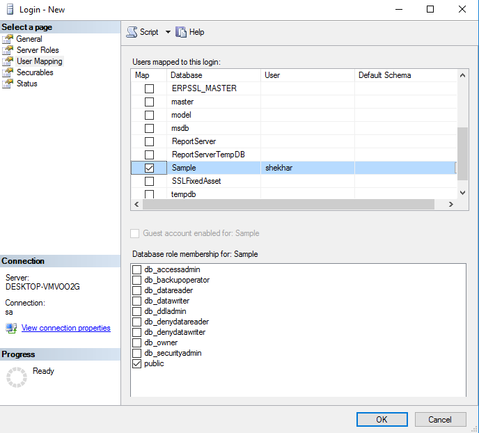 Hit OK button. Now map the user to a particular database. In my case I am using a “sample” database.