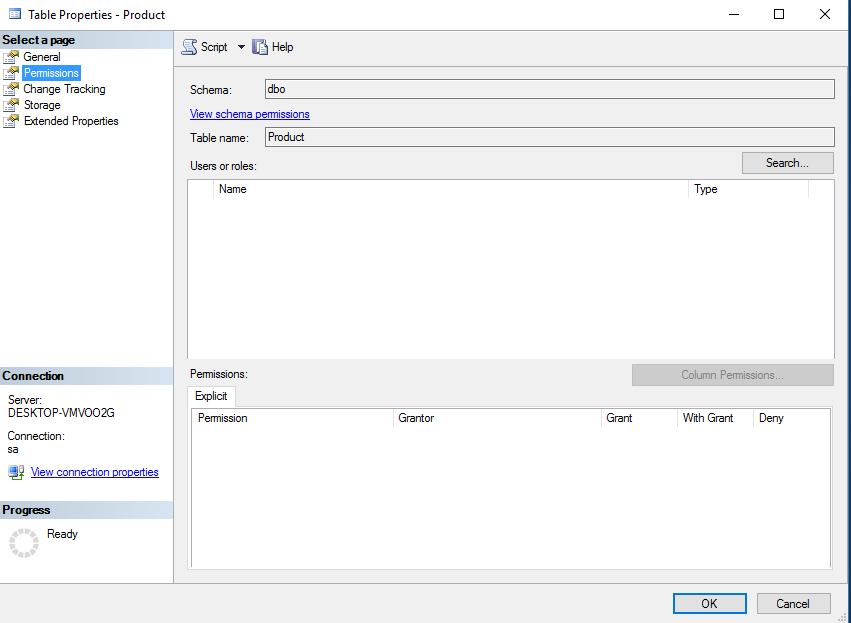 Now let’s set permission to that user to particular operations on this table. Right click on Table > Choose Properties.