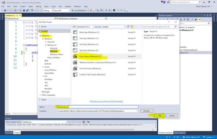 Click File, Add, New Project, Visual C#, Windows, Class Library (Windows 8.1). Name it SQLiteLibrary and click OK.