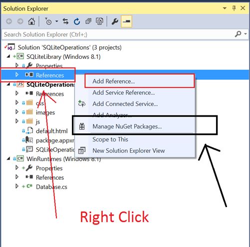 Now we have to add a reference ’SQLite for Windows Runtime’ and ‘sqlite-net’ in Class Library. For this, Right Click on Reference and Manage Nuget Packages