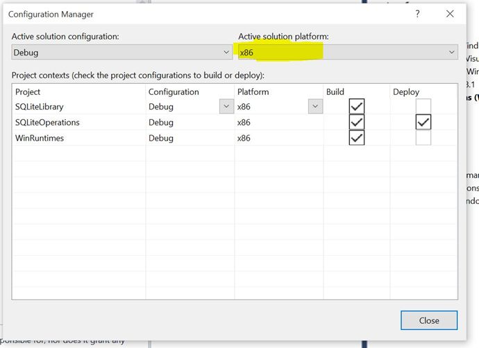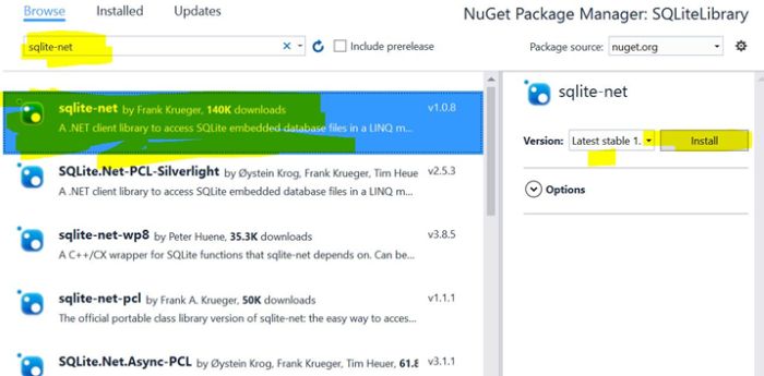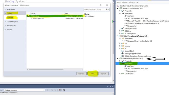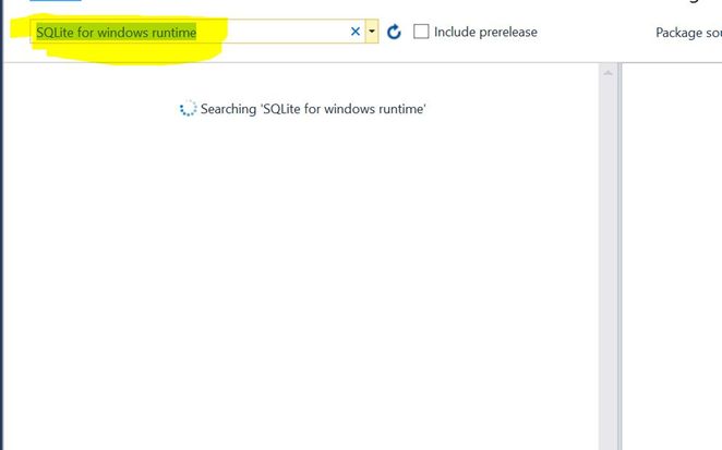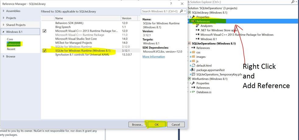 - SQLite for Windows Runtime (Alternatively, you can download this from here.Install it and restart Visual Studio)
