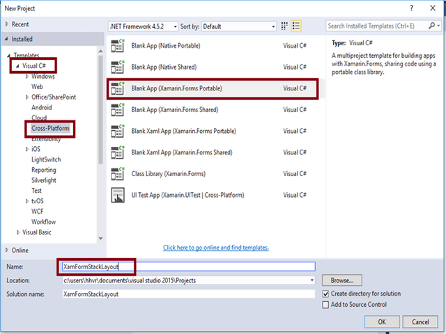 Open Visual Studio 2015. Go to Start -> New Project-> Select Cross-Platform (under Visual C#-> Blank App (Xamarin.Forms Portable)-> Give a suitable name for your app (XamFormStackLayout) ->OK.