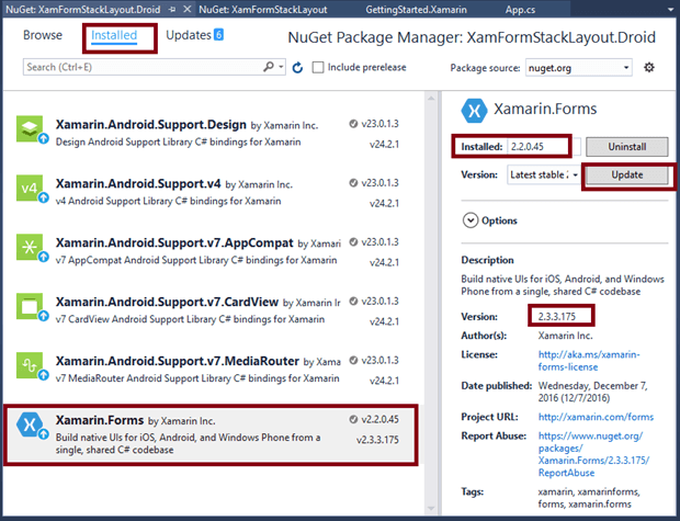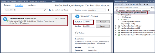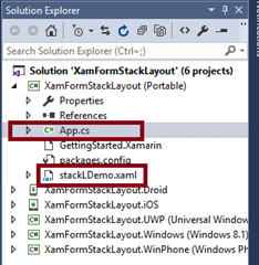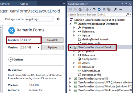 Now, we have to update the Xamarin Forms reference for portable projects and XamFormStackLayout_Droid project.