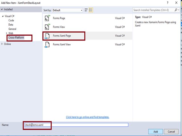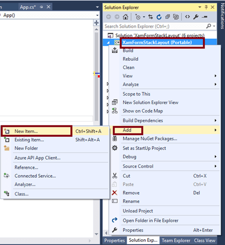 Add an XAML page for StackLayout Demo, right click XamFormStackLayout (Portable) project, and select ADD-> NewItem.