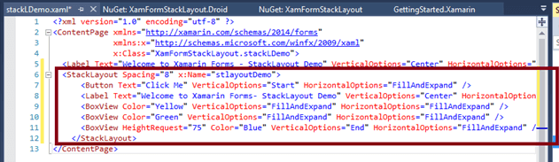 - <Label Text="Welcome to Xamarin Forms- StackLayout Demo" VerticalOptions="Center" HorizontalOptions="Center" />