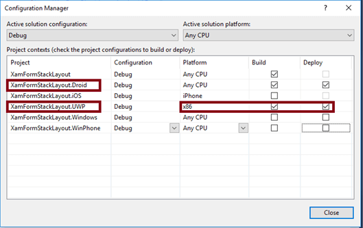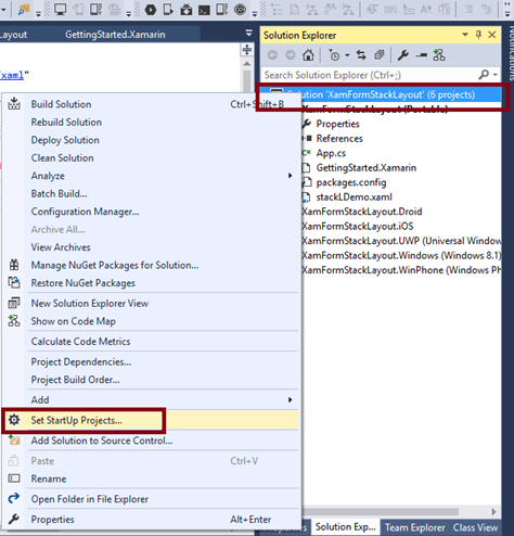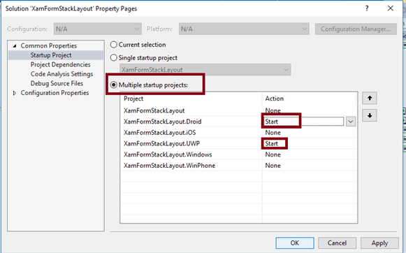 We will test Android and UWP. So, we can set multiple Startup Projects as XamFormStackLayout.Droid and XamFormStackLayout.UWP (Universal Windows).