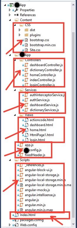 In this layer you can create HTML pages and angular services, controller,etc. On index page we can inject all .js,angular,bootstrap,css, because by default this page will be open.