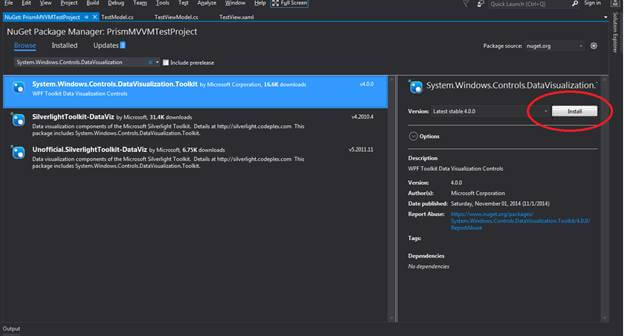 For Charting controls, type ‘System.Windows.Controls.DataVisualization ‘ in browse section, select that package, and click on "Install" button.