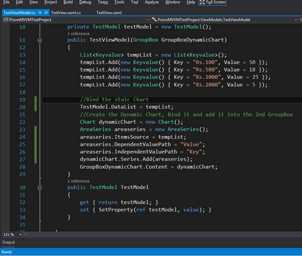 Add PrismMVVMTestProject.ViewModels namespace and bind the data context of TestView page to the ViewModel named ‘TestViewModel’. Then, pass the 2nd groupbox into it.