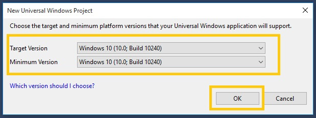 Here, we choose the Target Version and Minimum Version for our Universal Windows application. Click OK button,