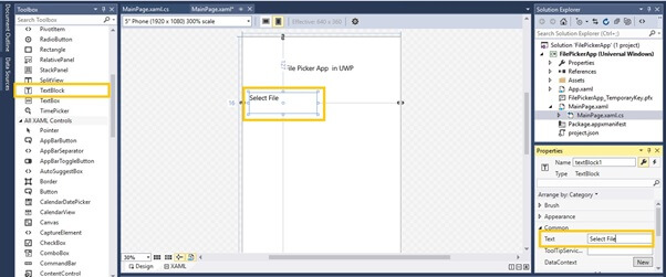 In the MainPage.xaml designing page, drag the Textblock button control from the tool box. Then, go to the Property window and change the Text as Select File.