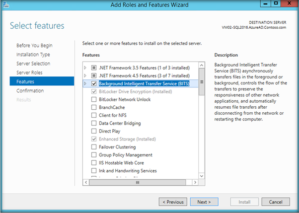 Check the required features that have to be installed. We already have set up SQL Server 2016 on the server, so let's uncheck the last option and install.
