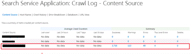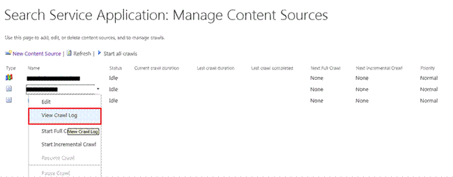 3. To view the crawl logs, click on Content Source -> View Crawl Log.