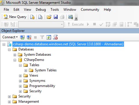 By now, we are all ready with server and database; all we need to do is to connect to SSMS. Once you click on SQL Database on left panel or refresh if it is already opened, you will find your database. Now, click on your database 'CSharpDemo' and you will find all the details in this regard.