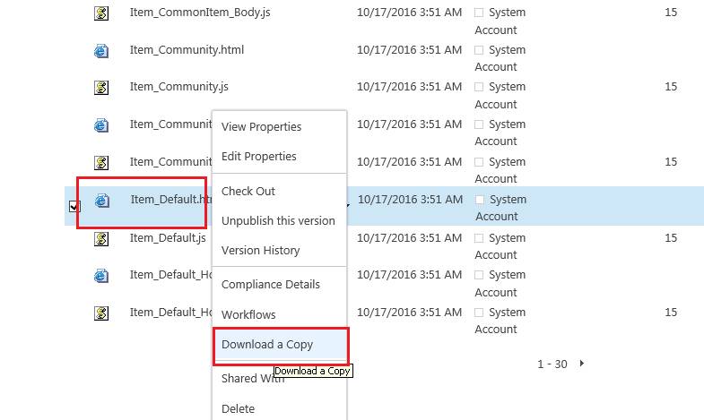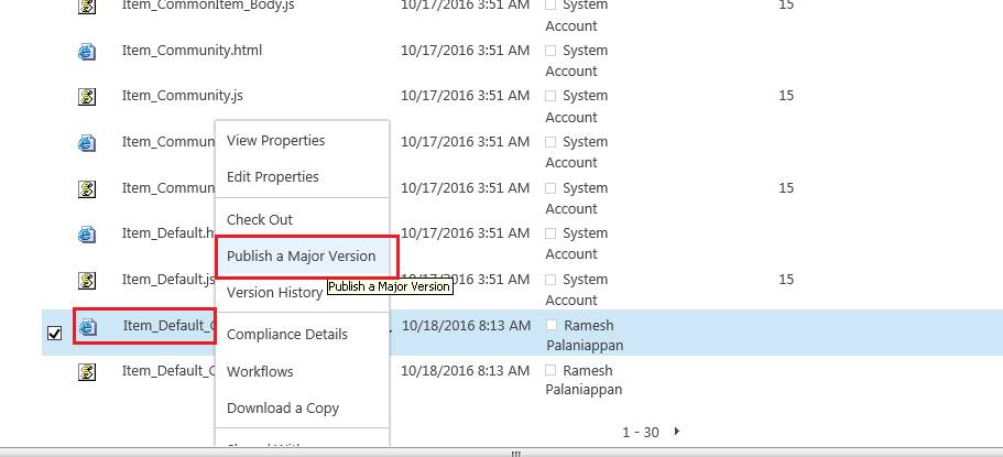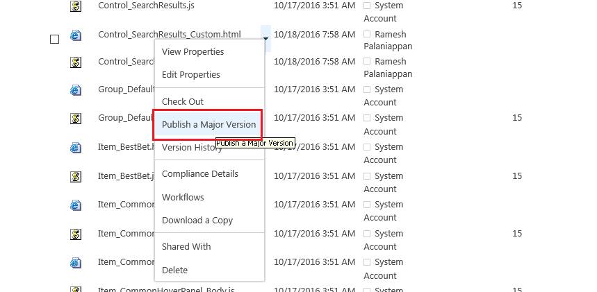 - Click on HTML file and publish it as a major version, while .JS file will automatically publish as a major version.
