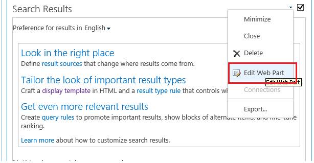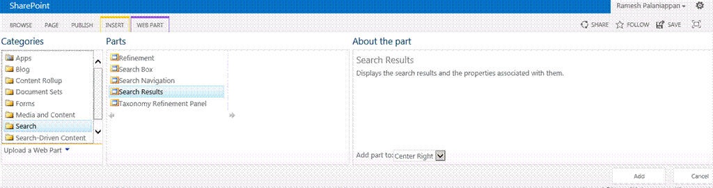 - Create new SharePoint publishing page and add Search Results Web part under Search group.