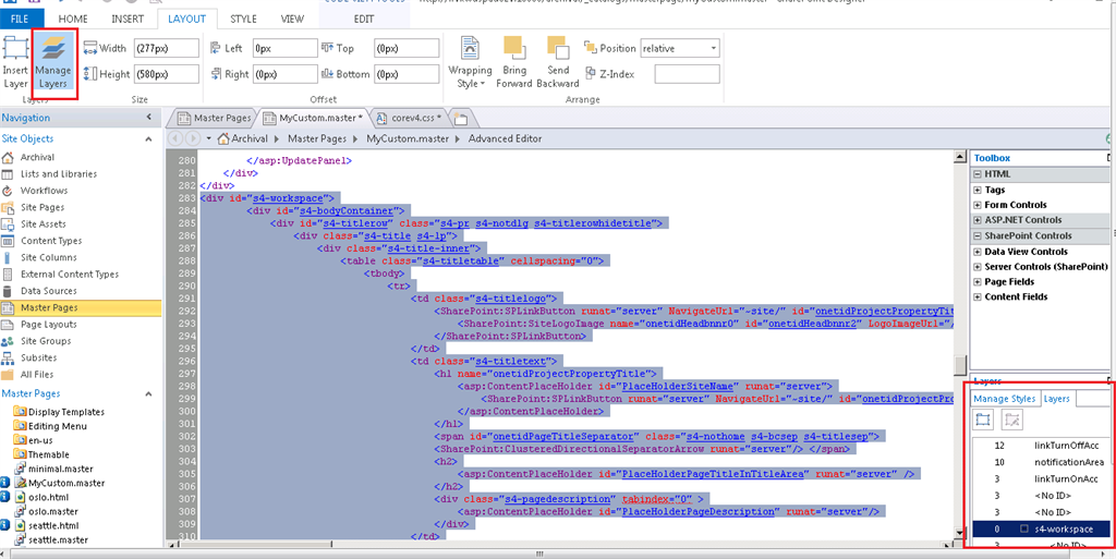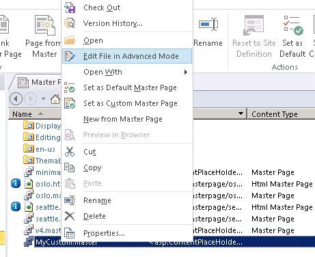 - Right click on MyCustom.master -> Edit File in advanced mode.