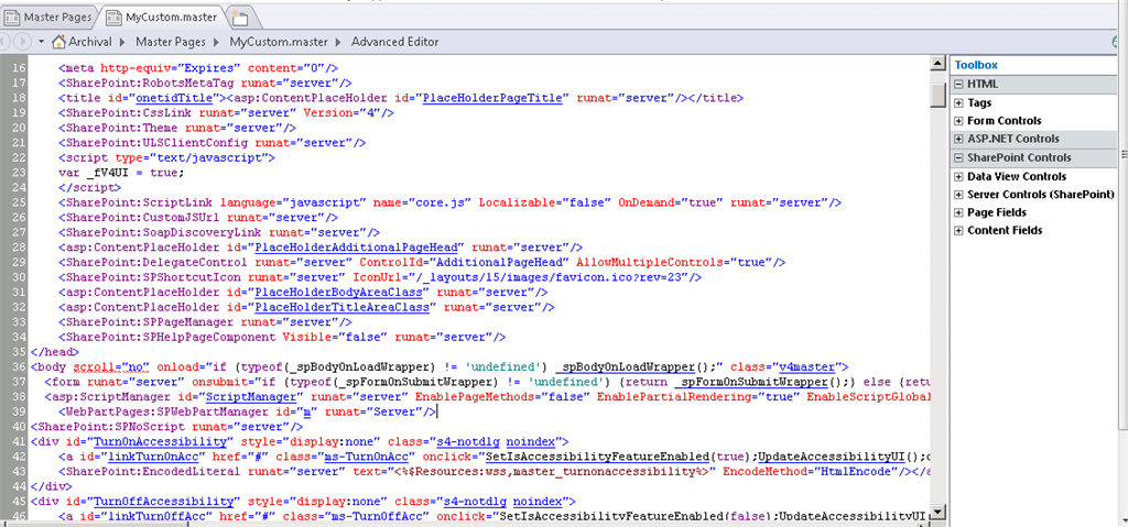 - MyCustom.master file opens in edit mode. Modify what we want to appear in the custom master page.