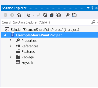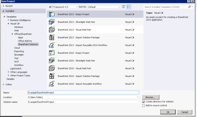 - Select the "SharePoint 2013 – Empty Project" template. Name the project as ExampleSharePointProject.