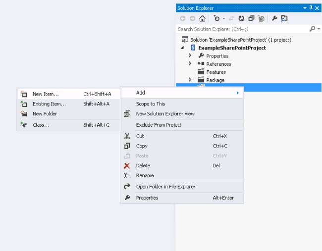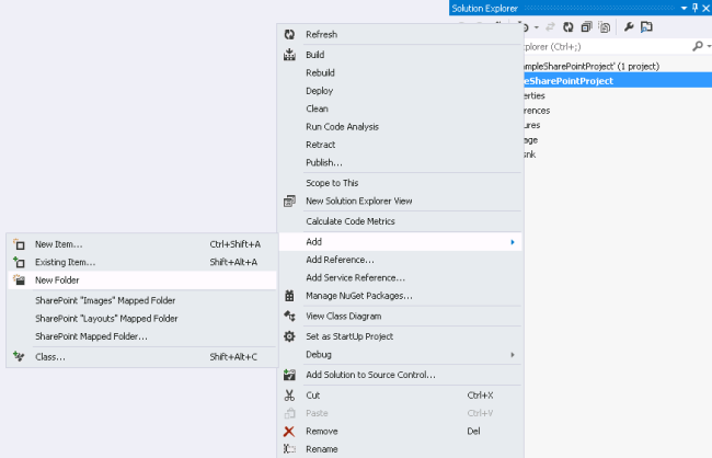 - Right click on ExampleSharePointProject -> Add -> New Folder. Name it as "Site Columns".
