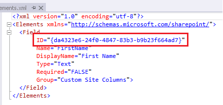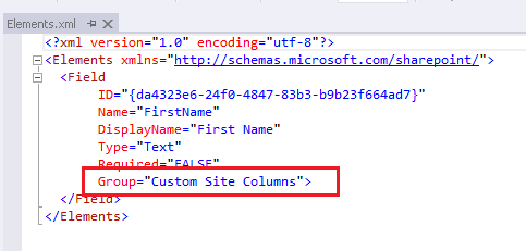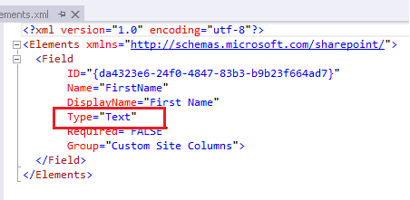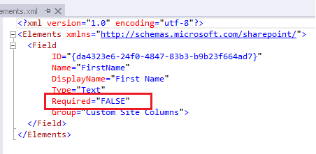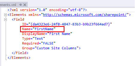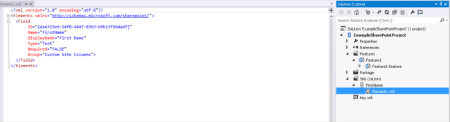 - Once you create a site column, you will notice that Visual Studio has automatically added a Feature to the project and included the new site column “FirstName” in it.