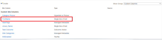 - Open SharePoint site. Go to “Site Settings” -> “Site Columns” under Web Designer Galleries. The list of all the site columns present in the site appears. Select the “Custom Site Column” group. Our “FirstName” site column appears.