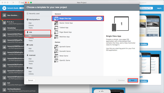 Click New Solution—> select iOS—>select App--> choose Single View app. Afterwards, click Next.