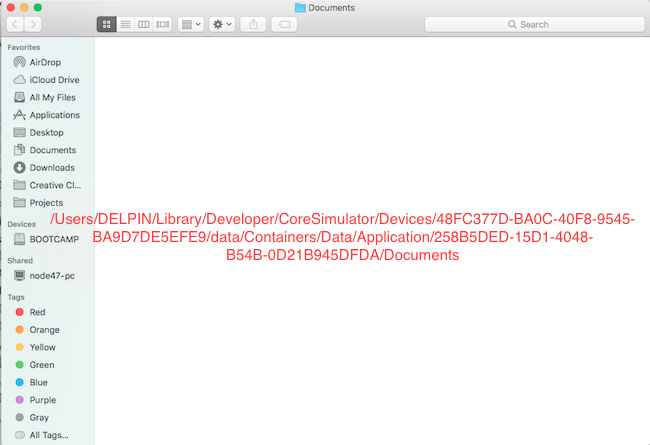 Ex:/Users/DELPIN/Library/Developer/CoreSimulator/Devices/48FC377D-BA0C-40F8-9545-BA9D7DE5EFE9/data/Containers/Data/Application/258B5DED-15D1-4048-B54B-0D21B945DFDA/Documents)