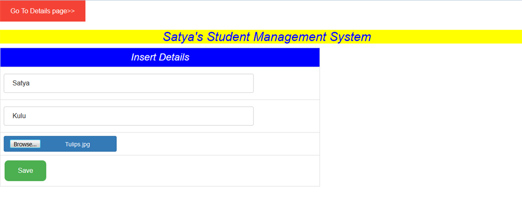 Code DescriptionThe below-mentioned code defines how to insert records to the respected parameters and how after successful insertion, the page will redirect to the details or displayimage View page.