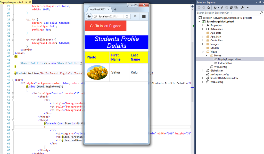 Here, I have created two Views - Index and DisplayImage - under the Home Controller file. Index View is created to insert the records and the DisplayImage View is for showing the details of student information with images.
