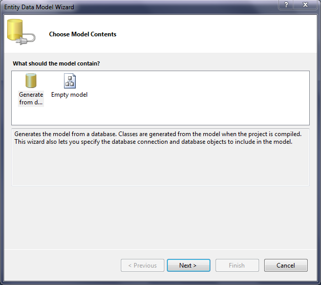 Let's add an "ADO.NET Entity Data Model" in "DataModel" folder. To add, right-click the DataModel folder and go to Add -> New Item. A dialog window will open. Select "Data" option on the left side of the dialog window and select "Ado.Net Entity Data Model". Finally, click OK.