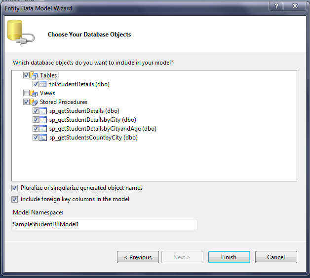 Funciton Import for Stored Procedure sp_getStudentDetails