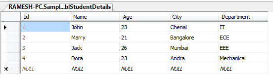 Next, we have to create a simple student table. Here, I have designed a simple table and named it as "tblStudentDetails". Insert some sample records.