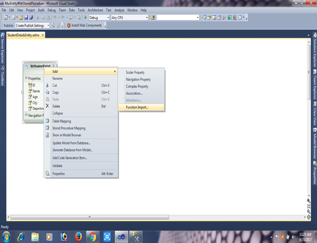 Now, we have to import the stored procedure into Entity Framework. Stored procedure in Entity Framework is called a function. For that, right click the entity model -> Add->Function Import. Please refer to the below images for reference.