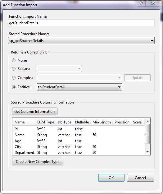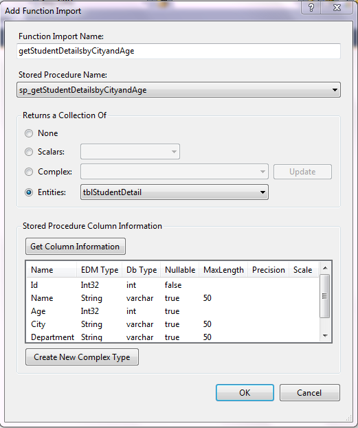 Funciton Import for Stored Procedure sp_getStudentDetailsbyCityandAge