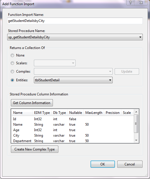 Funciton Import for Stored Procedure sp_getStudentDetailsbyCity
