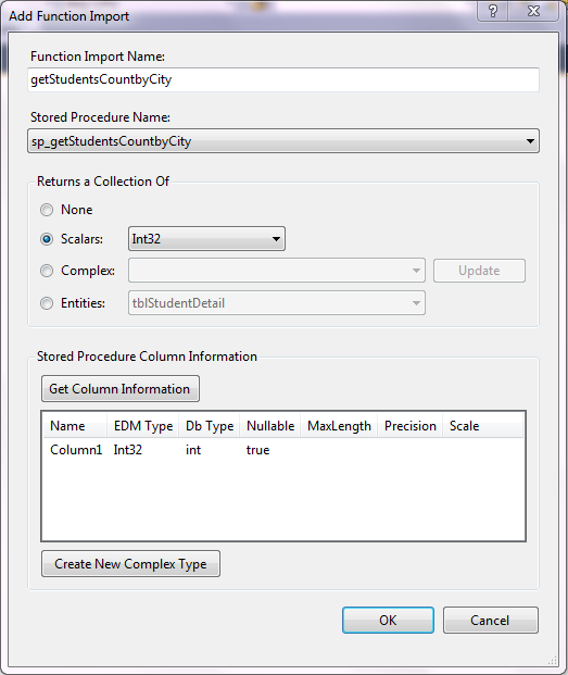 Funciton Import for Stored Procedure sp_getStudentsCountbyCity