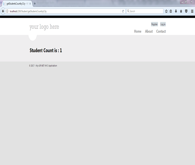 Let us create a simple View for action method "getStudentsCountbyCity". It's going to return integer value instead of student list. We just passed this integer value using ViewBag.StudentsCount.